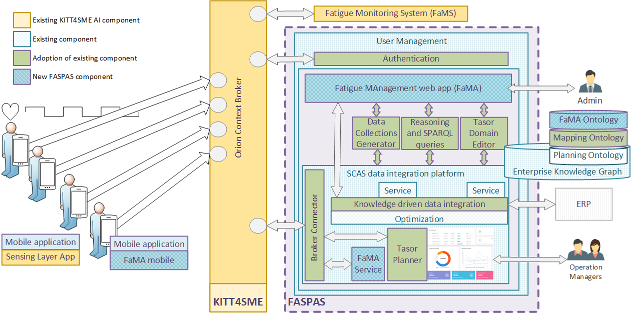 FASPAS addresses the challenge of scaling up the number of work orders in a discrete manufacturing environment by leveraging automatic generation of plans and schedules. The aim is to optimize manufacturing operation as well as workforce in mass production of heterogeneous custom products. When dynamic aspects such as physiological state and fatigue of employee are taken into consideration the problem becomes even more challenging. Main benefits include cost reduction, reliable commitments to customers, improved production throughput as well as higher job satisfaction level in the workplace. In order to integrate all aspects of the problem, FASPAS semantically annotates data from FaMS, an AI-based KITT4SME component, that analyzes physiological data indicating fatigue acquired by wearable devices (such as blood pressure, heart rate, galvanic skin response) together with static characteristics (skills, age, work experience and similar). The semantically annotated datasets will be used for semantics-based reasoning in order to perform optimal work order planning and scheduling taking into account all relevant factors.